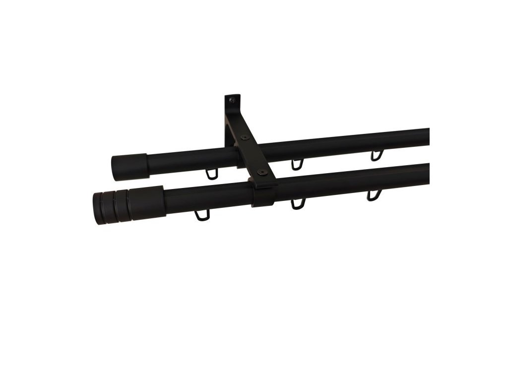 Dvojitá záclonová souprava, obsahuje tyč s drážkou průměr 19mm, stěnové nosníky, černé kluzáky s háčkem, koncovky a upevňovací materiál.Doplňkové parametry