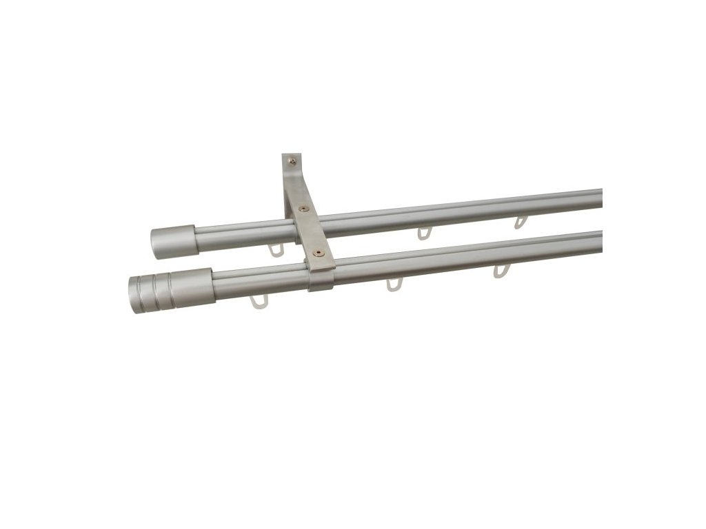 Dvojitá záclonová souprava, obsahuje tyč s drážkou průměr 19mm, stěnové nosníky, plexi kluzáky s háčkem, koncovky a upevňovací materiál.Doplňkové parametry